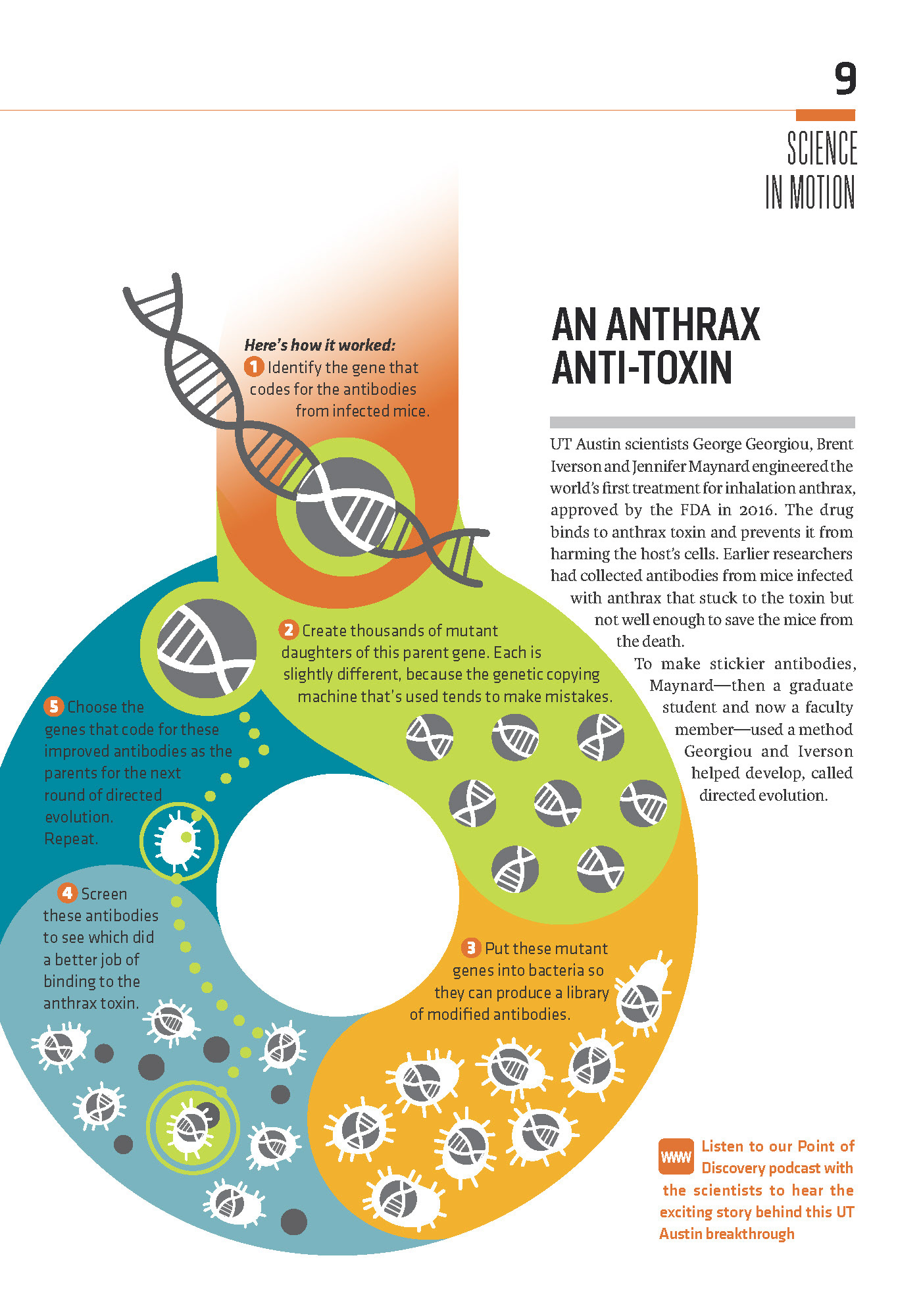 A full page infographic for the Texas Scientist magazine. This graphic illustrates how researchers developed an antidote for Anthrax, through a process called "directed evolution".